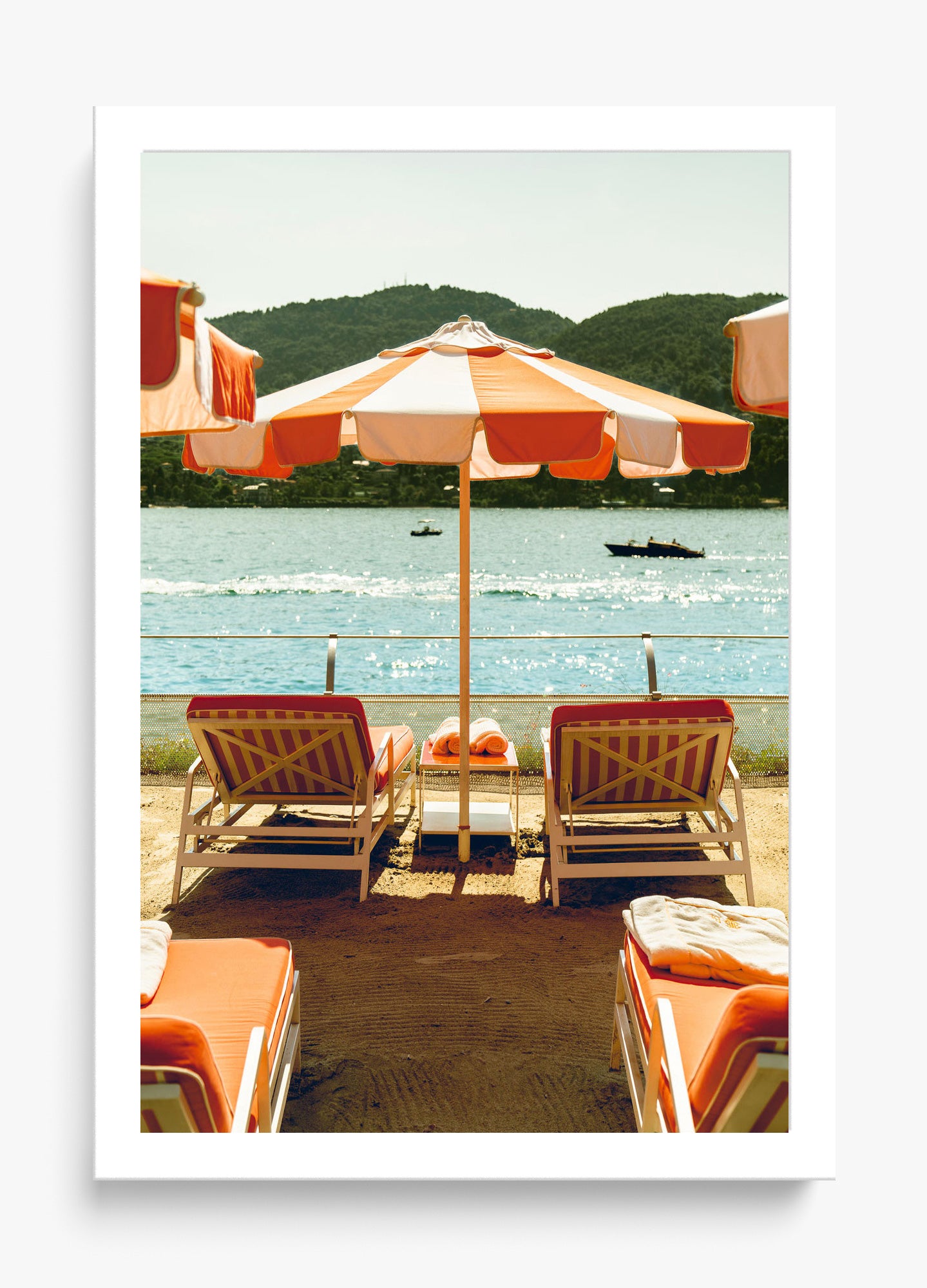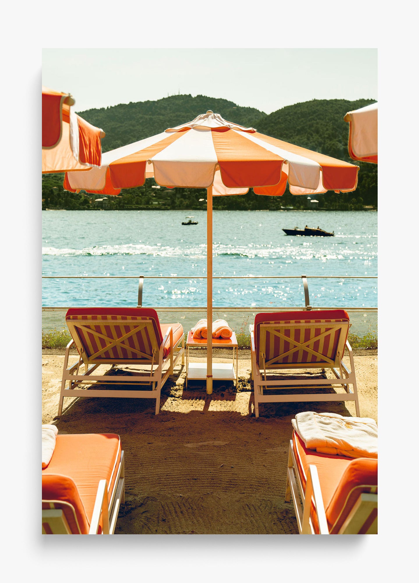 Sunlit elegance captured at Lake Como's iconic Hotel Tremezzo. This serene Italian lakeside moment radiates warmth and timeless beauty, perfect for coastal and luxury interiors.